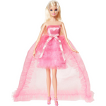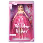 Make a wish upon a doll! Barbie Birthday Wishes (Pink Satin Dress) Doll is a super sweet gift for a loved one on their special day. This doll has luxurious blonde hair pulled back from her face with a pearlescent headband. She also comes with pearl earrings, strappy stilettos, and a doll stand. She is pink as can be in a beautiful strapless dress! The satin bodice blossoms into a voluminous skirt made of gathered tulle. A sheer tulle overlay cinches at the waist with a white ribbon and then floats down to graze the floor. Customizable packaging offers a place to write a personalized message, making this special occasion doll even more memorable.